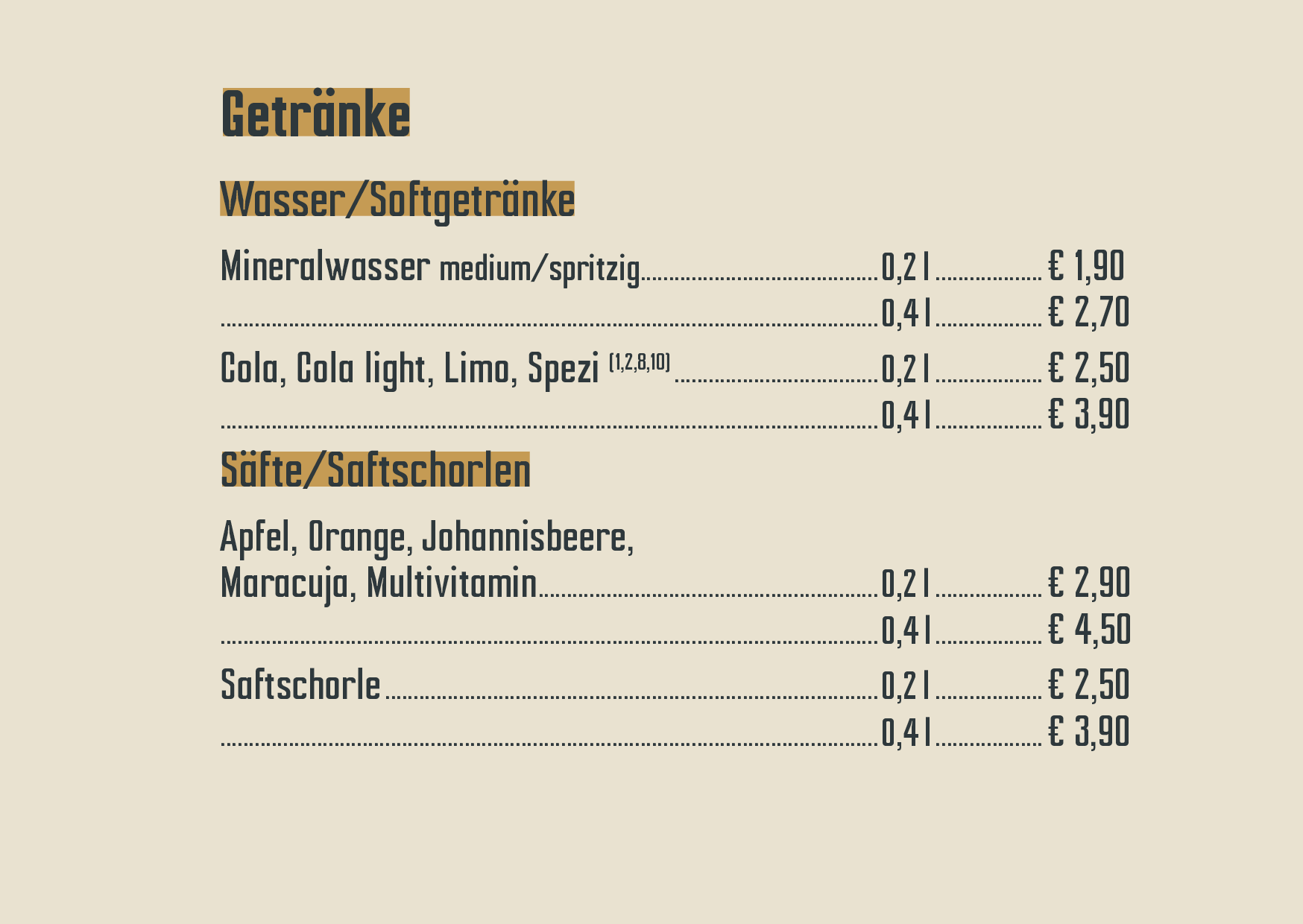 Cola, Cola light, Limo, Spezi (1,2,8,10) 0,4 l 3,90 €