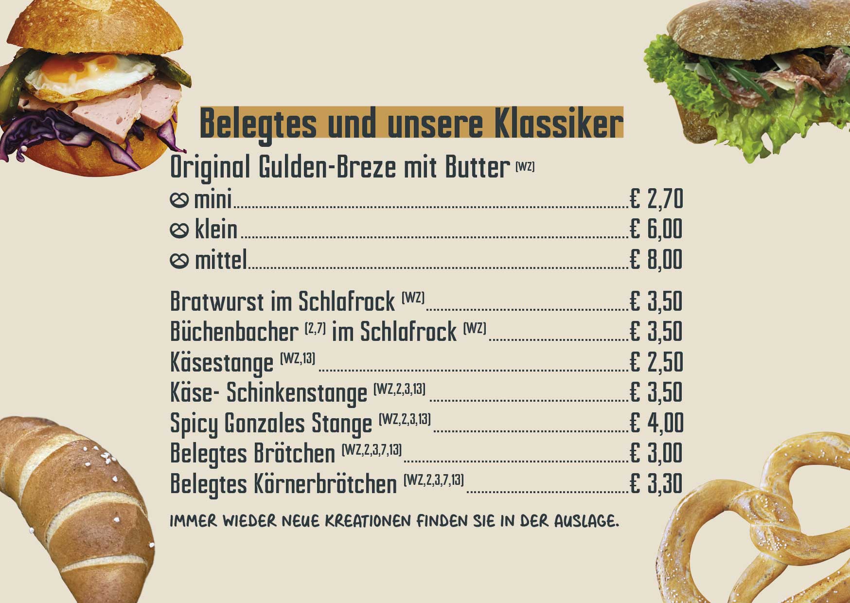 Eine Mini Breze (WZ), zwei Brötchen / Brot nach Wahl (WZ), Butter (13), Marmelade & Käse (13), zwei Rühr- (13) oder Spiegeleier mit Speck (2,3) & Tomate-Mozzarella (13), O-Saft 0,2 l, ein Heißgetränk
