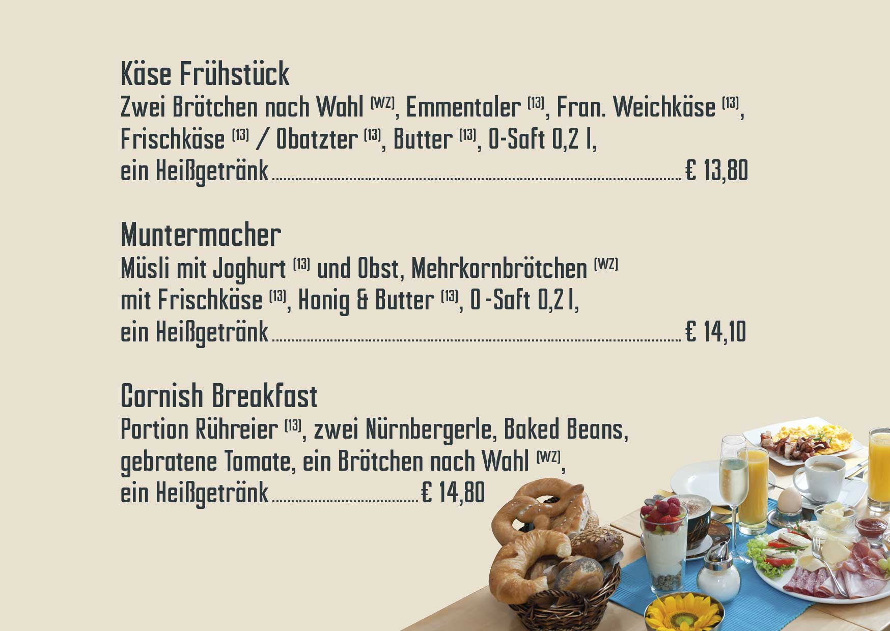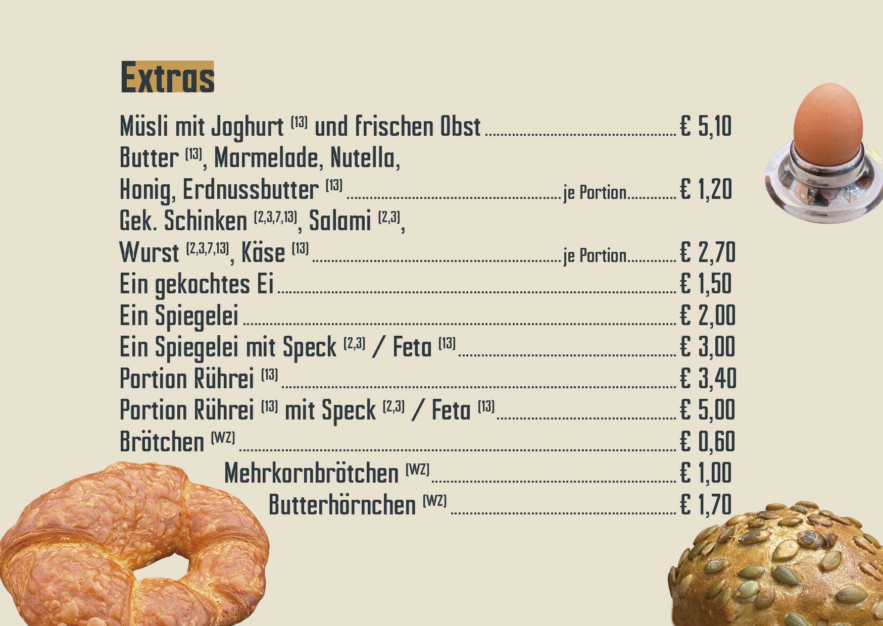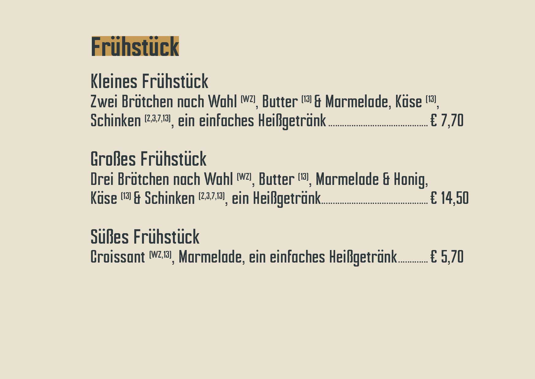 Drei Brötchen nach Wahl (WZ), Butter (13), Marmelade & Honig, Käse (13), Schinken (2,3,7,13), ein Heißgetränk