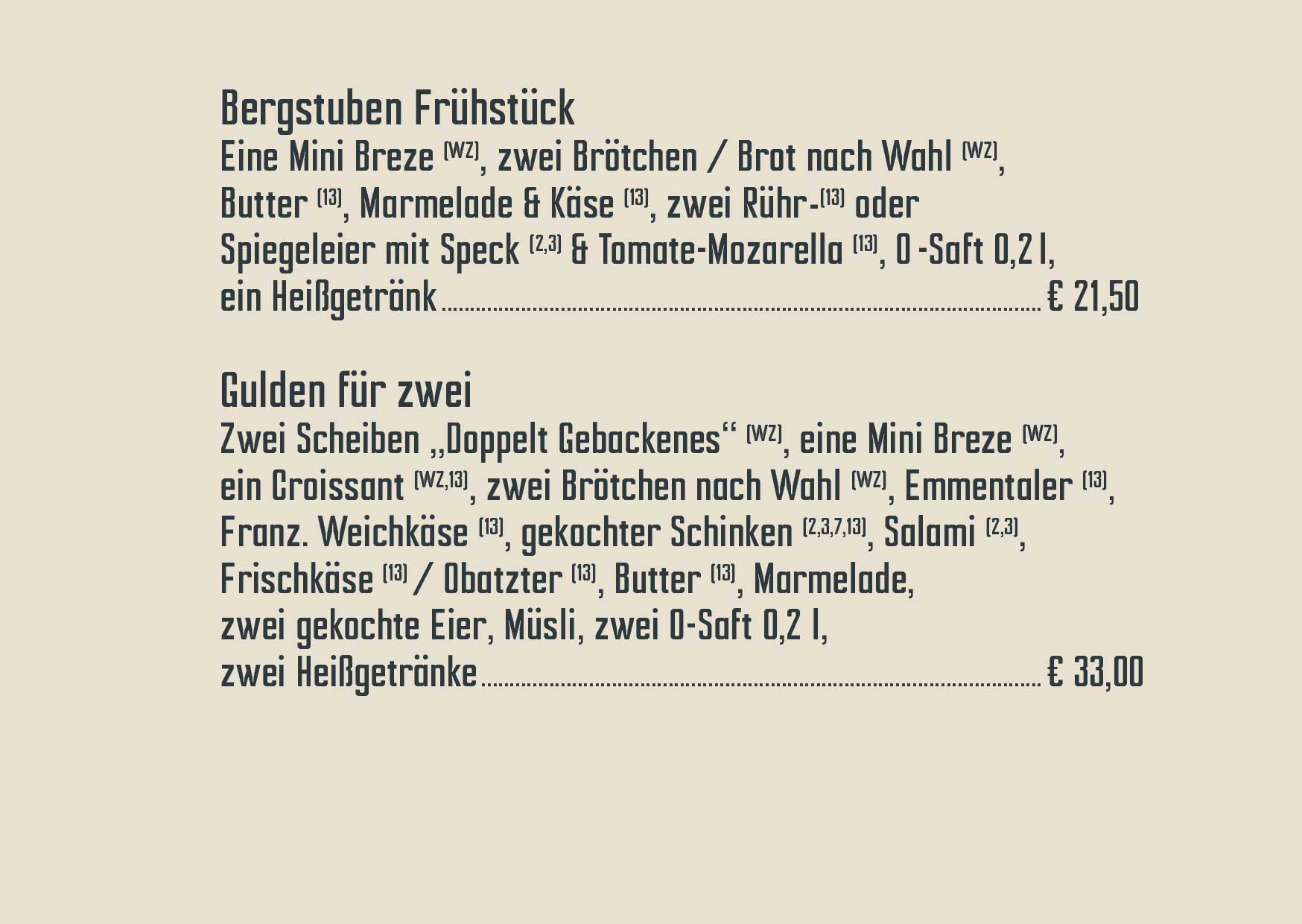 Zwei Scheiben „Doppelt Gebackenes“ (WZ), eine Mini Breze (WZ), ein Croissant (WZ,13), zwei Brötchen nach Wahl (WZ), Emmentaler (13), Franz. Weichkäse (13), gekochter Schinken (2,3,7,13), Salami (2,3), Frischkäse (13) / Obatzter (13), Butter (13), Marmelade, zwei gekochte Eier, Müsli, zwei O-Saft 0,2 l, zwei Heißgetränke